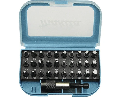Makita schroefbitset universeel P-73374 31-delige bitset in kunststof box met riemclip. Diverse passingen in bitbox Philips, Pozidriv en Torx, inclusief universele magnetische bithouder.