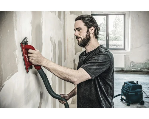De handschuurmachine met afzuiging zorgt voor stofarm en effectief werken in de gipsplatenbouw. Opkomend schuurstof kan door de R-VAC compatibele handschuurmachine gemakkelijk worden opgezogen met een bouwstofzuiger.