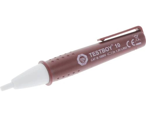Testboy 10 Contactloze Spanningstester 110-1000V AC. Geeft optisch aan als er spanning geconstateerd wordt. Werkt op 2 meegeleverde 1,5 AAA batterijen. IP44, CATIII 1000V.