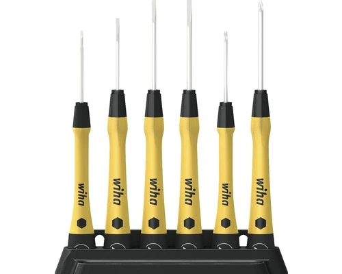 De uitdaging bij het werken aan elektronische componenten is dat deze al bij de geringste spanningen beschadigd kunnen worden. Met de elektrostatisch geleidende fijnschroevendraaiers PicoFinish® ESD bent u deze taak moeiteloos de baas. Dankzij hun lange, slanke handgrepen en de sneldraaizone zijn de fijnschroevendraaiers ideaal voor nauwkeurig en subtiel werken aan gevoelige werkstukken. Het ergonomische handgreepdesign met zachte delen zorgt voor comfortabel werken. De soepel draaiende kap ondersteunt snel draaien met gevoel. Verder zorgen de opgedrukte schroevendraaierpictogrammen op de draaibare kap voor gemakkelijk selecteren van het juiste schroevendraaierprofiel. De set bevat 6 fijnschroevendraaiers PicoFinish® en een houder. Daarin kunnen de fijnschroevendraaiers netjes worden opgeborgen op de werkplek. Het dissipatieve gereedschap leidt elektrostatische energie gecontroleerd en veilig af. De ESD- fijnschroevendraaiers zijn gemaakt conform de internationale norm IEC 61340-5-1 en garanderen derhalve maximale bescherming van elektronische componenten. De schroevendraaiers hebben een oppervlakteweerstand van 106 – 109 Ohm.