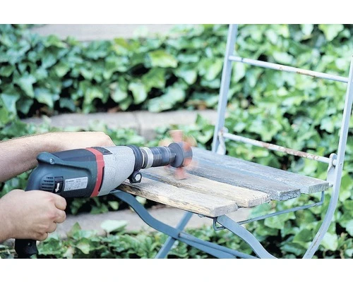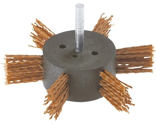 Waaierborstel voor boormachines, ideaal voor het reinigen, ontroesten en polijsten van hout, metaal en steen. Lange levensduur. Agressief door grove nylondraadbezetting.