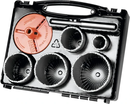 | Meegeleverd worden | 5 x boorkrans-opzetstukken: Ø 33 / 53 / 68 / 73 / 83 mm, 1 x bevestigingsschijf, 1 x centreerboor |